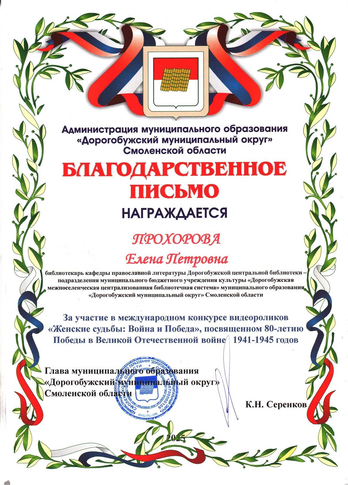 Администрация муниципального образования «Дорогобужский район» Смоленской области выражает благодарность Дорогобужской детской межпоселенческой библиотеке и Дорогобужской городской библиотеке - филиалу № 4 за качественное проведение мероприятий в г. Дорогобуже в рамках VIII Всероссийского конкурса городов России «Семья и город – растем вместе».
