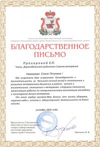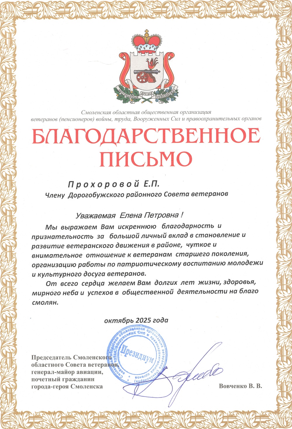 Администрации муниципального образования «Дорогобужский район» Смоленской области выражает благодарность библиотекарю Озерищенской сельской библиотеки-филиала №13 Прохоровой Елене Петровне за многолетний и добросовестный труд, инициативу, активное участие в культурно-досуговых мероприятиях и в связи с профессиональным праздником – Днём работника культуры.
