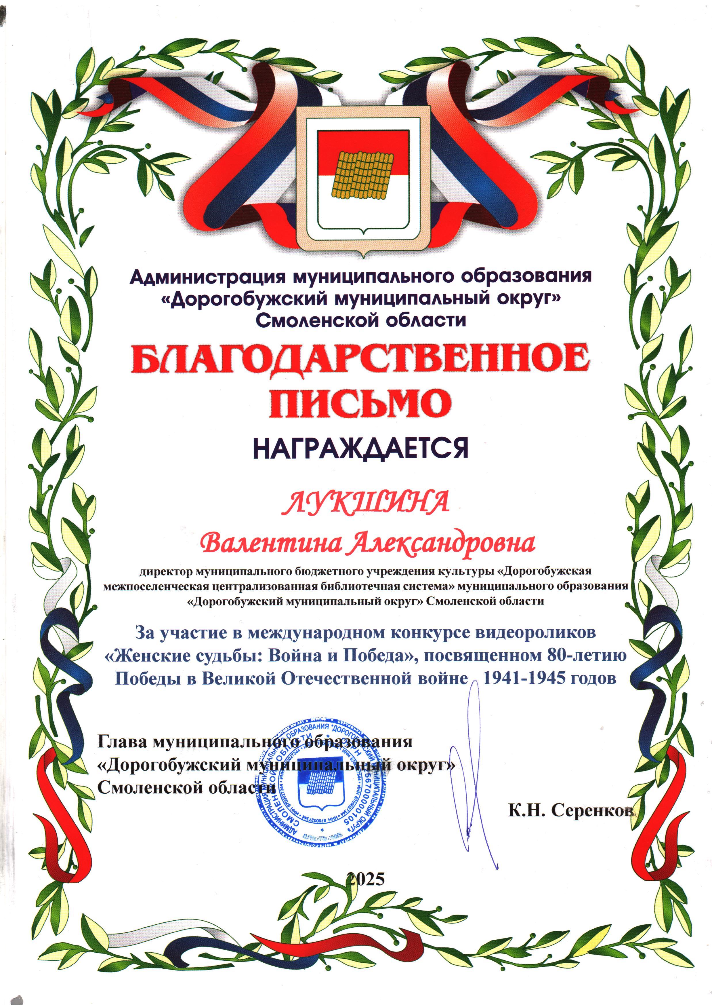 Благодарственное письмо Комитета по культуре, туризму и спорту Администрации муниципального образования «Дорогобужский район» Смоленской области заведующему Дорогобужской городской библиотекой-филиалом №4 Рыжмановой Валентине Николаевне за многолетний добросовестный труд, значительный личный вклад в развитие библиотечного дела в Дорогобужском районе Смоленской области.