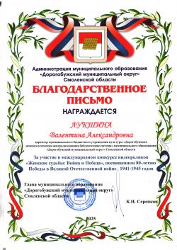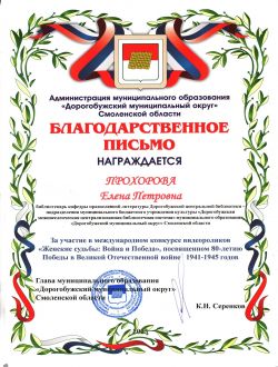 Грамота ГБУК «Смоленская областная детская библиотека имени И.С. Соколова-Микитова» за участие в Областном конкурсе «Как это было» среди муниципальных библиотек Смоленской области, работающих с детьми, на лучшее библиотечное мероприятие к 75-летию Победы в Великой Отечественной войне вручена коллективу Дорогобужской центральной детской библиотеки.