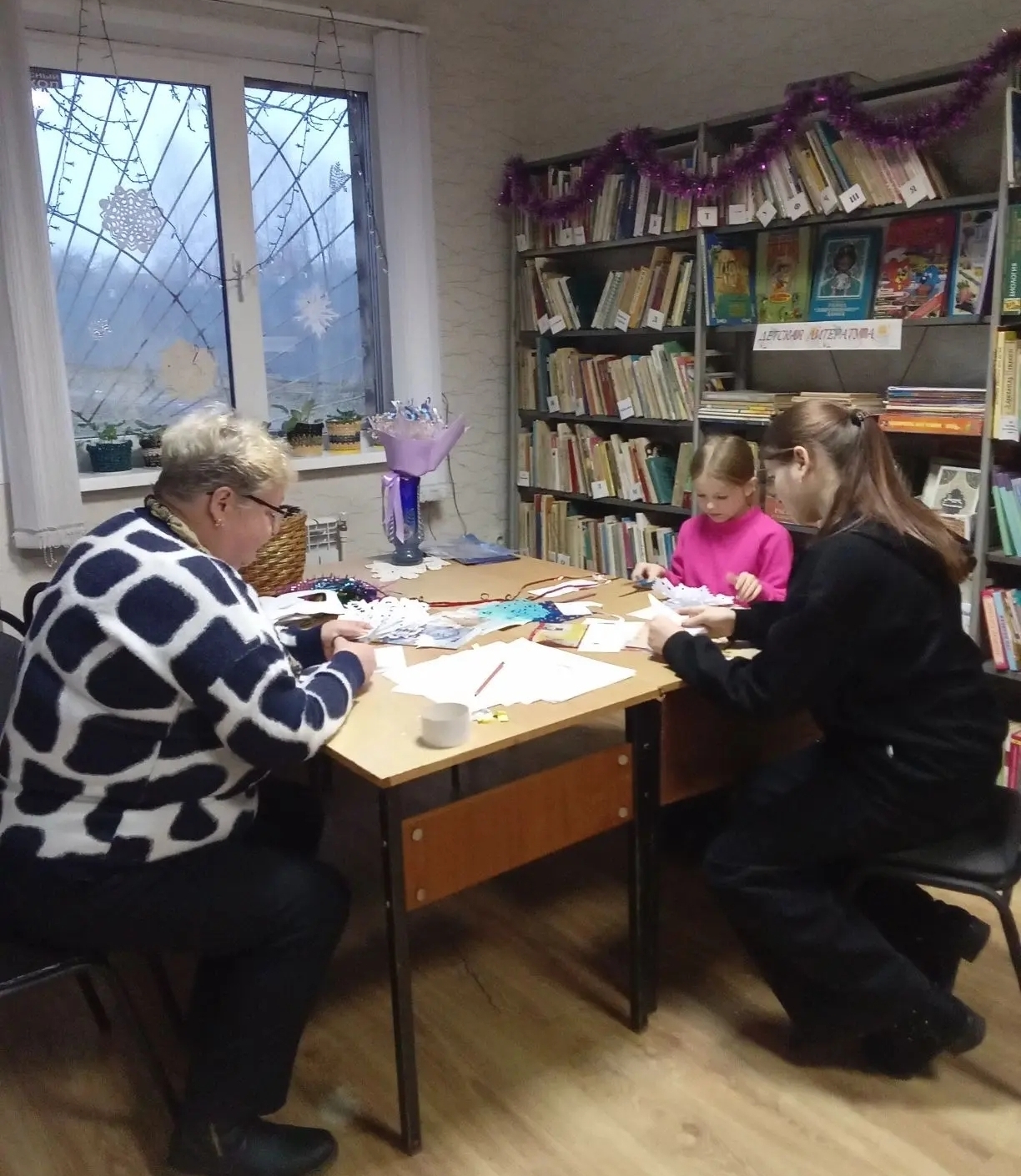 Снежинка – главный атрибут зимней сказки и прекрасное изящное украшение не только елки, но и интерьера в целом. Юные читататели аккуратно и терпеливо вырезали разнообразные снежинки, активно проявляли фантазию и придумывали свои узоры, с интересом учились тому, как из обычной бумаги, своими руками, создать новогоднее настроение. В результате совместного творчества участники вырезали очень красивые снежинки самых разных форм и узоров.