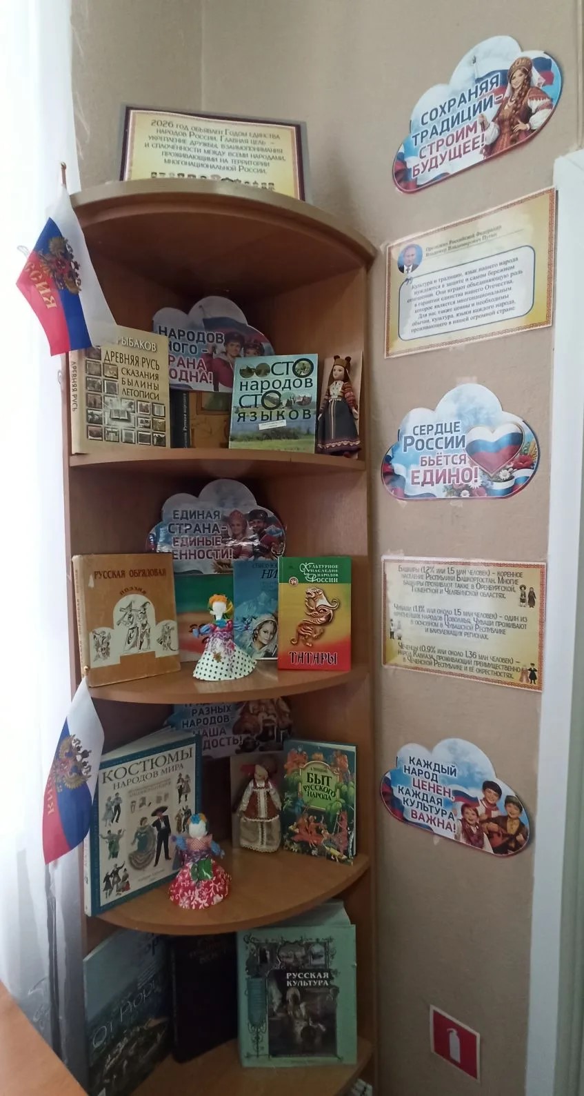 Россия - многонациональное государство, в котором общей историей, судьбой и языком объединены сотни народностей. На полках, среди книг, расположились куклы в национальных костюмах.