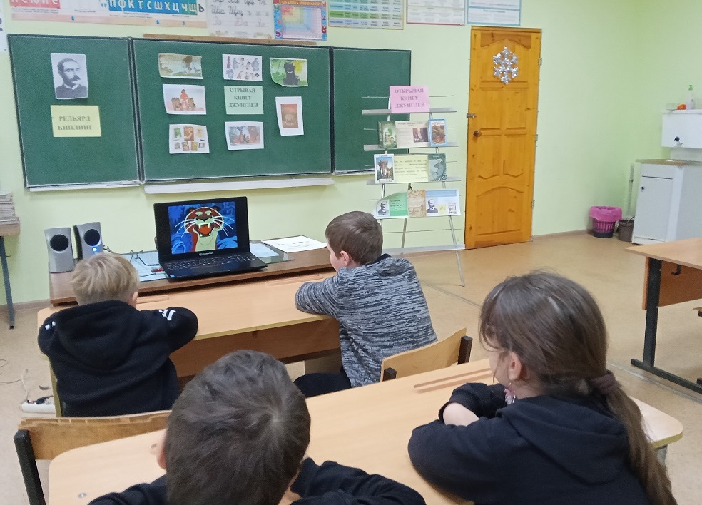С помощью слайд-шоу «Сказочные джунгли Киплинга» детей ввели в тему джунглей и их значимостью в произведениях Киплинга. Все это дополнялось  звуками джунглей. В этот день книги, представленные на выставке «Открывая книгу джунглей», помогли читателям ближе познакомиться с удивительными сказками писателя и уверенно ответить на вопросы интерактивной викторины «Книга джунглей». Ребята постарались ответить на вопросы викторины «Угадай героя», соединив название героя с его именем.Ну и, конечно, с удовольствием посмотрели отрывки из мультфильмов по произведениям Киплинга «Маугли», «Рикки –Тикки – Тави», и «Кошка, гулявшая сама по себе».