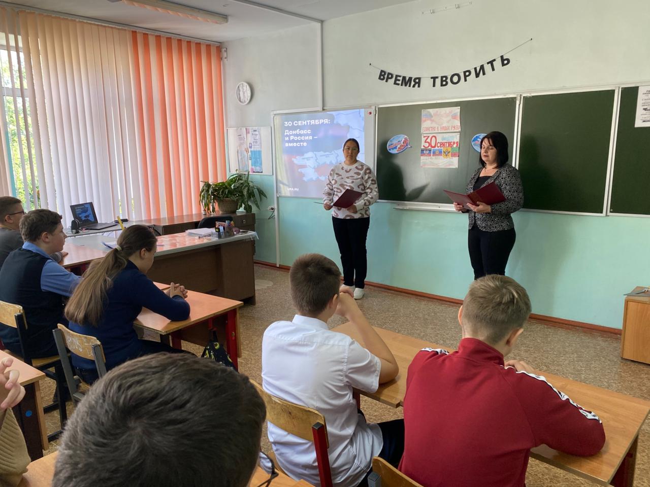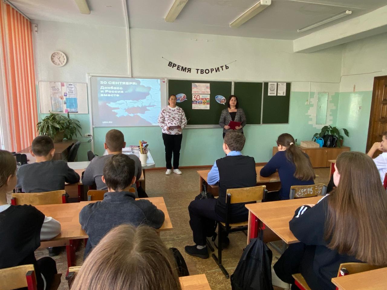 В рамках празднования этой даты сотрудники Городской библиотеки провели актуальный разговор «Одна страна, одна Россия» для ребят 7 «в» класса Дорогобужской школы №2. При помощи электронной презентации и видеоматериалов, подготовленных  сотрудниками городской  библиотеки, ребята узнали о том, как произошло воссоединение с Россией осенью 2022 года, какой трудный путь прошли жители регионов, отстаивая свое право говорить на русском языке, добиваясь независимости и признания.