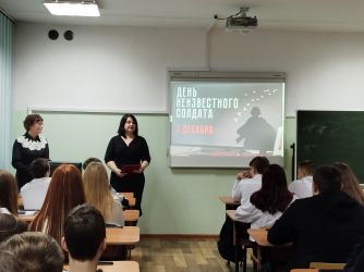 В преддверии этого праздника, 1 декабря, для учащихся 8 «а» и 8 «в» классов Дорогобужской школы №2, было проведено совместное мероприятие, подготовленное сотрудником Городской библиотеки и директором Дорогобужского историко-краеведческого музея Т.А. Московченко. Цель мероприятия - увековечить подвиг всех бойцов, которые пали в боях за Родину во время Великой Отечественной войны и других вооруженных конфликтов, но остались неизвестными.