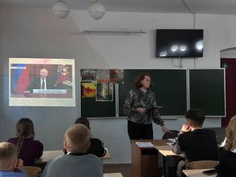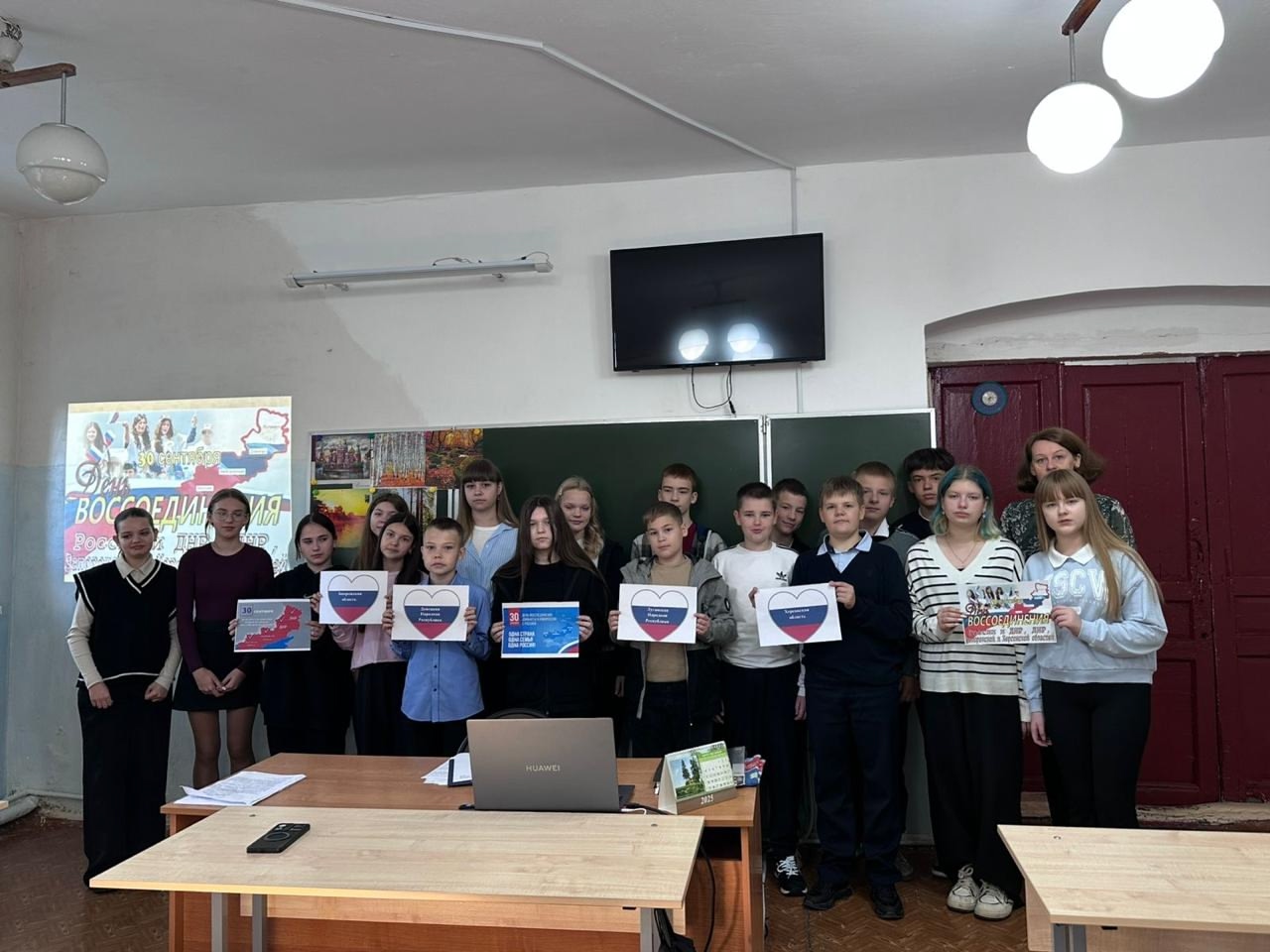 Школьники узнали об исторических корнях единства новых субъектов с Россией, о том, какой трудный путь прошли жители этих регионов, в течение восьми лет отстаивая свое право говорить на русском языке, услышали рассказо тех, кто сейчас стоит на защите нашей Родины, увидели кадры церемонии подписания договоров о вхождении новых субъектов в состав Российской Федерации в Георгиевском зале.