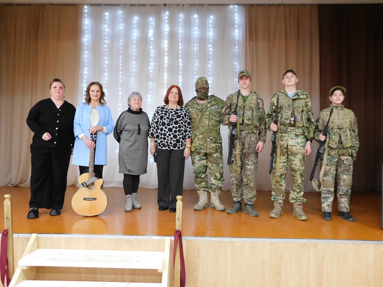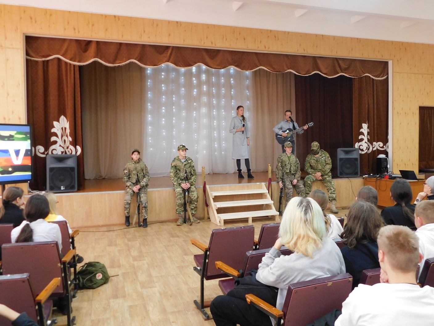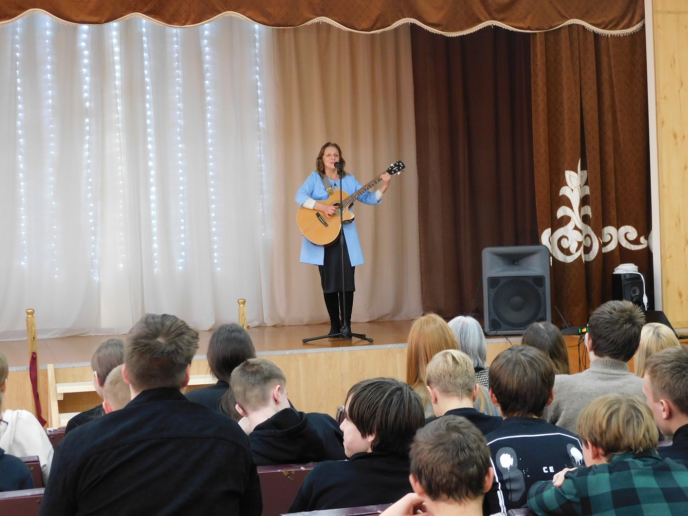 Член Союза журналистов РФ, поэт, прозаик Роза Гречанова прочитала ученикам свои стихи: «Моя великая Россия!», «Настоящий герой». Солист, поэт, музыкант Михаил Купоров и солистка образцового коллектива вокальной студии Ольга Минченкова выступили с музыкальными композициями: «Разведка» (автор – участник СВО), и «Русь». В исполнении Е. Рыбчинской прозвучала песня «С чего начинается Родина?».