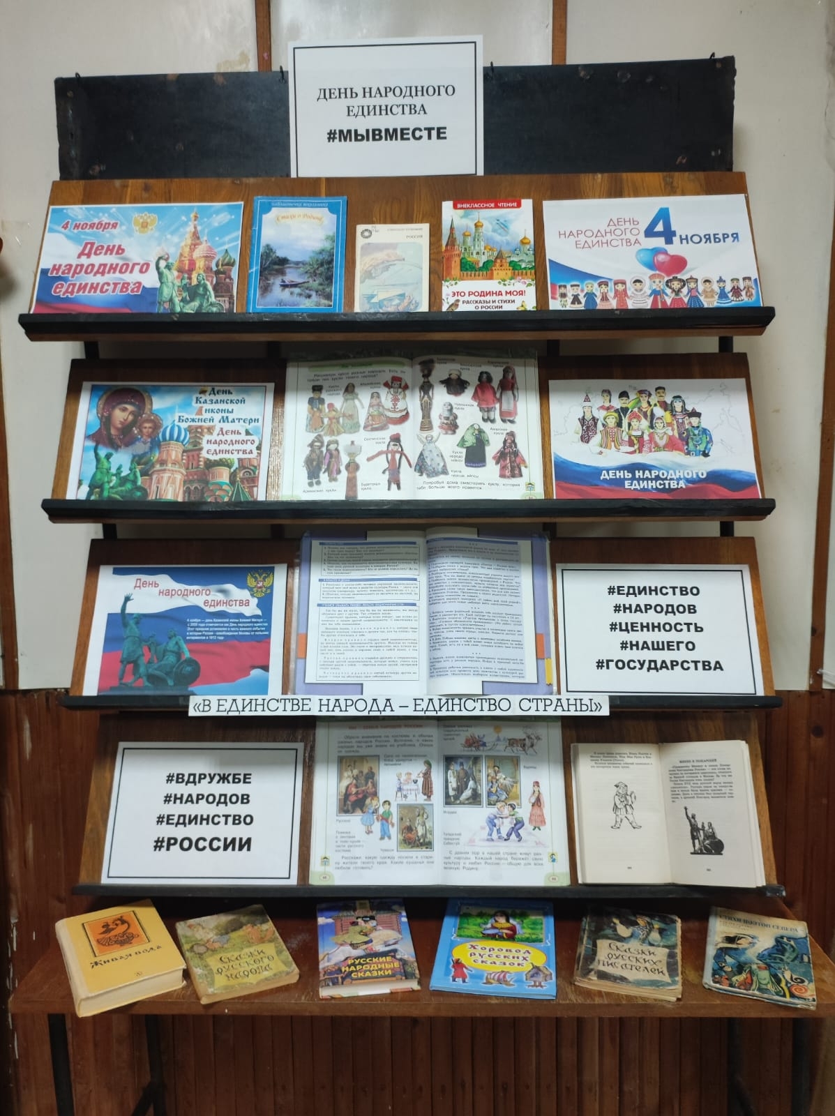 К мероприятию была оформлена тематическая книжно-иллюстративная выставка «День народного единства». На выставке представлены книги и иллюстративные материалы, рассказывающие об истории праздника, его значении для страны, а также о героических событиях Смутного времени, которые стали символом сплочённости народа.
