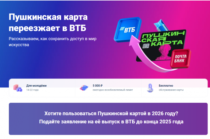 С 1 января 2026 года роль оператора Программа «Пушкинская карта» (далее – Программа) перейдет от АО «Почта Банк» к Банку ВТБ (ПАО).